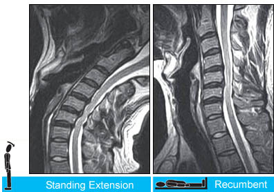 You need the upright scan to see the position-dependent focal posterior disc herniation at the C4/5 level (arrow). Note the asscociated spinal cord compression on the standing-extension scans in both the sagittal (top left) and axial planes(bottom left).